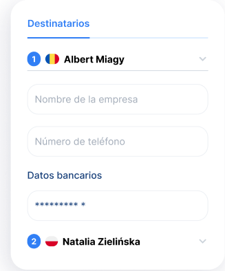 Ingresa los detalles de cada persona o entidad a la que deseas enviar dinero. Ten a mano sus nombres, detalles bancarios y los países en los que se encuentran. Solo necesitas hacer esto una vez: los detalles del receptor se guardan para que los pagos futuros sean lo más rápidos y fáciles posible.