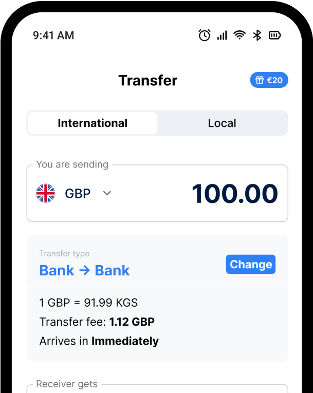 Most transfers to Central Asia are free! This means we add zero fees on instant card transfers, bank transfers and next-day transfers. The receiver gets the exact amount that our app tells you they’ll get. No hidden fees, no nasty surprises.